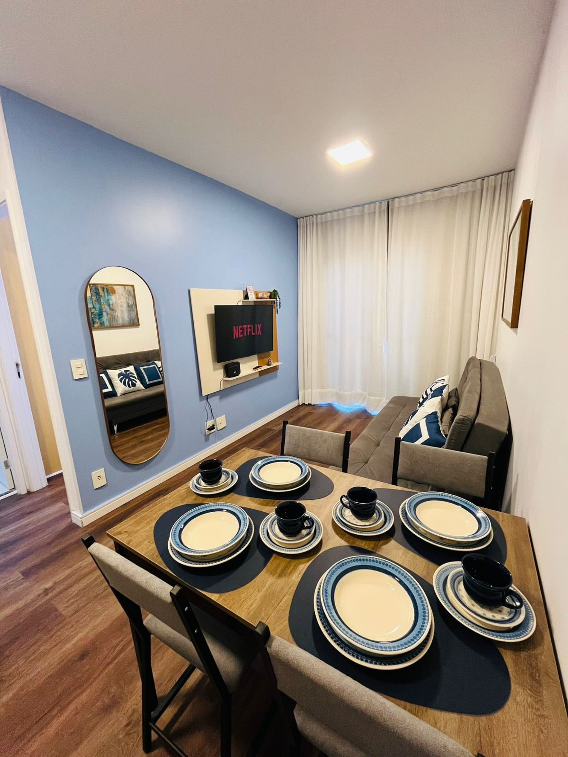 O apartamento oferece Wi-Fi, Smart TV, uma cama de casal confortável e um sofá-cama, acomodando até duas pessoas extras com comodidade.
