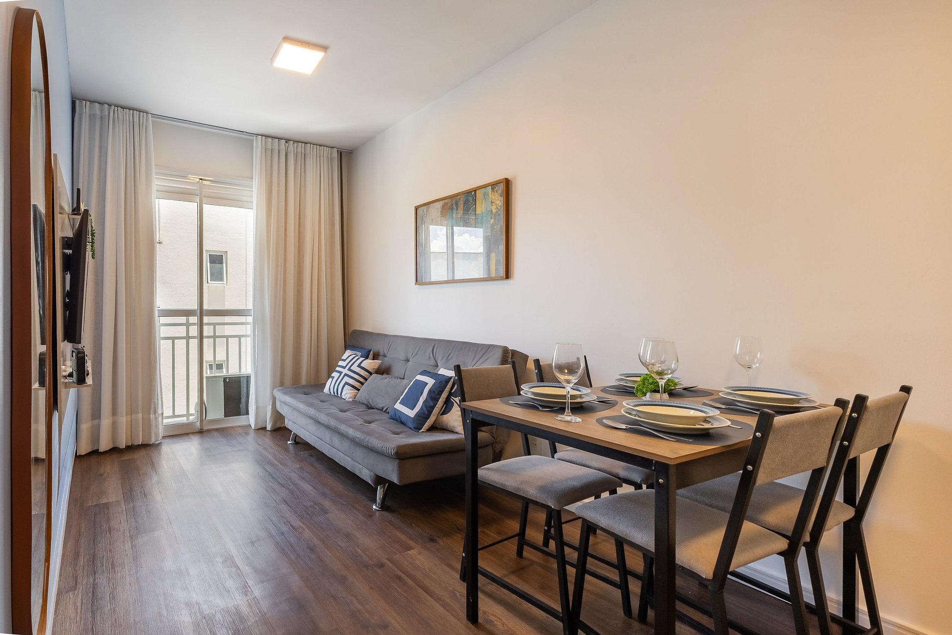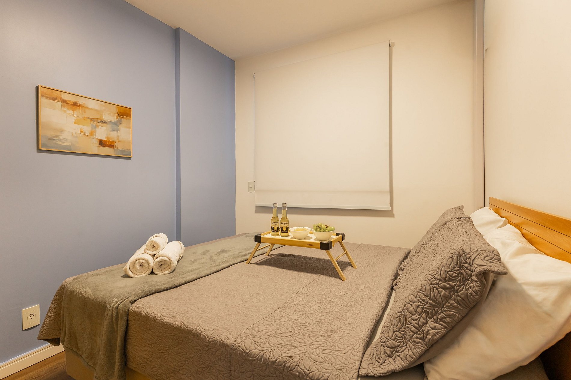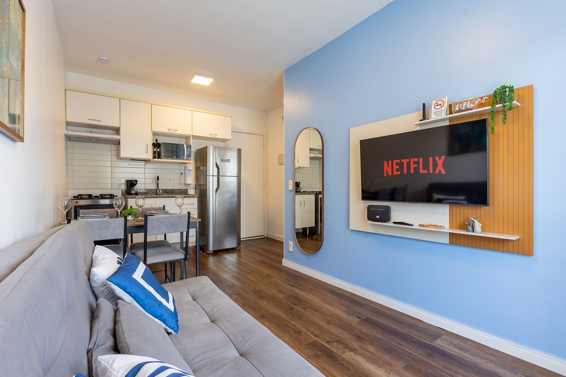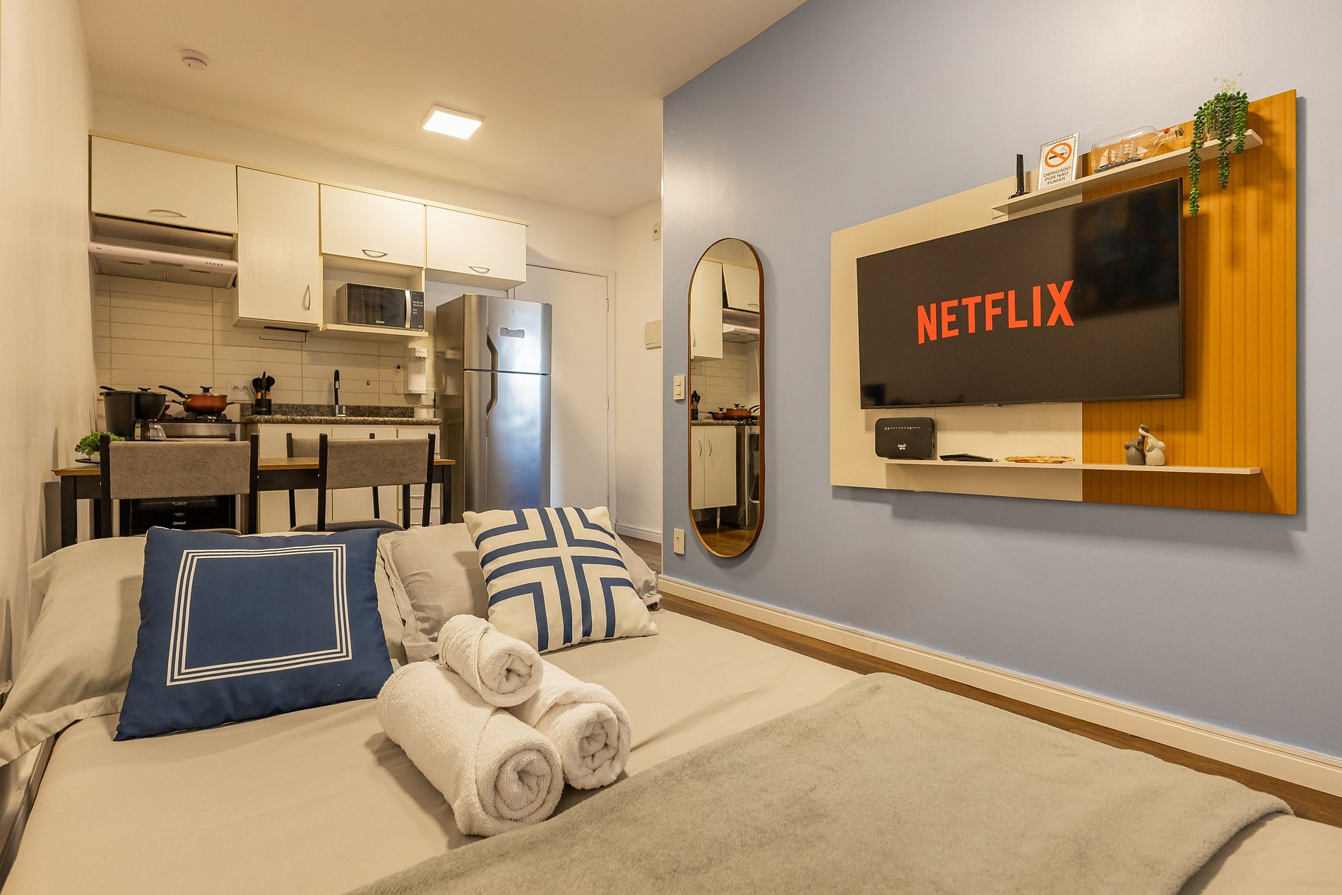 O apartamento oferece Wi-Fi, Smart TV, uma cama de casal confortável e um sofá-cama, acomodando até duas pessoas extras com comodidade.