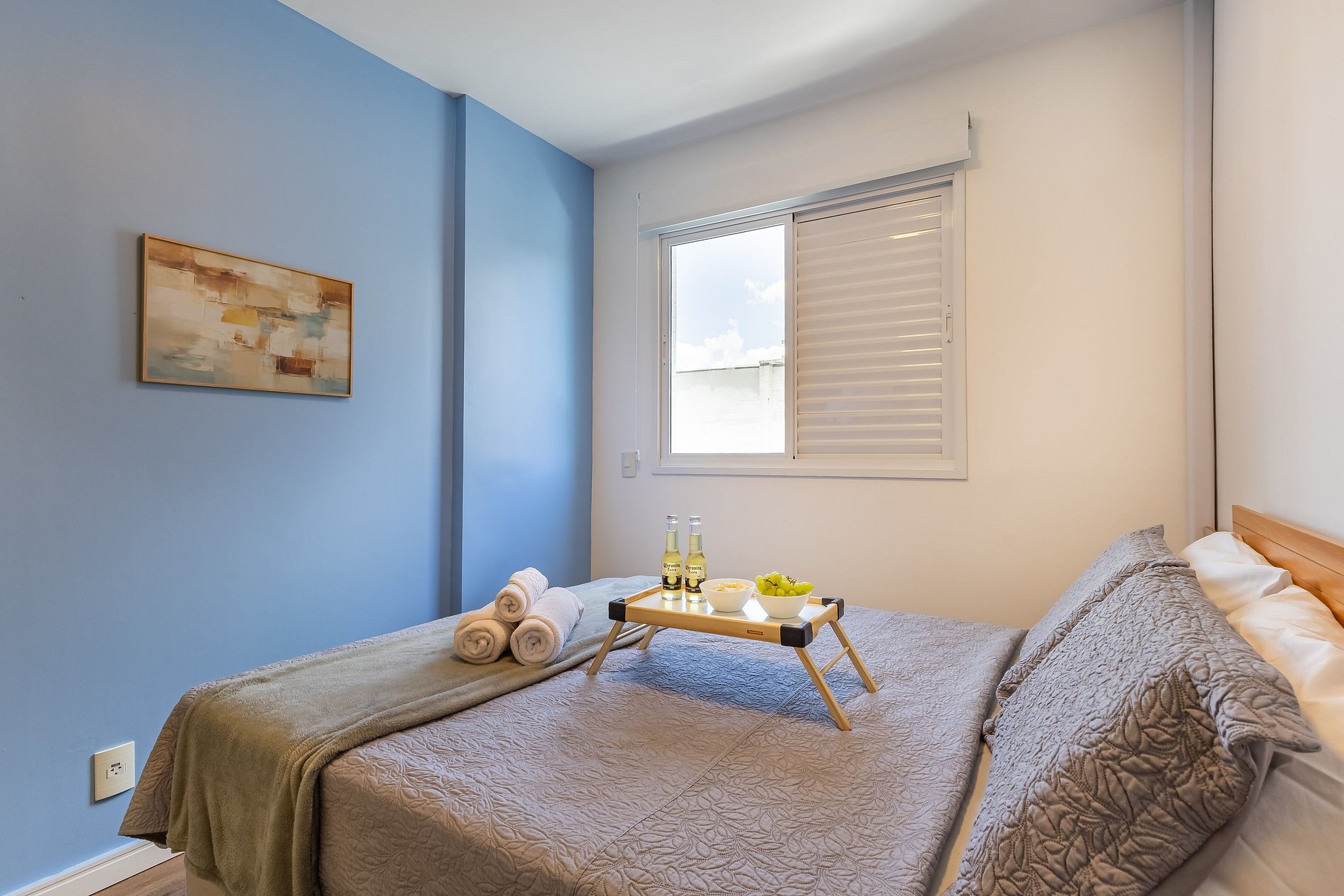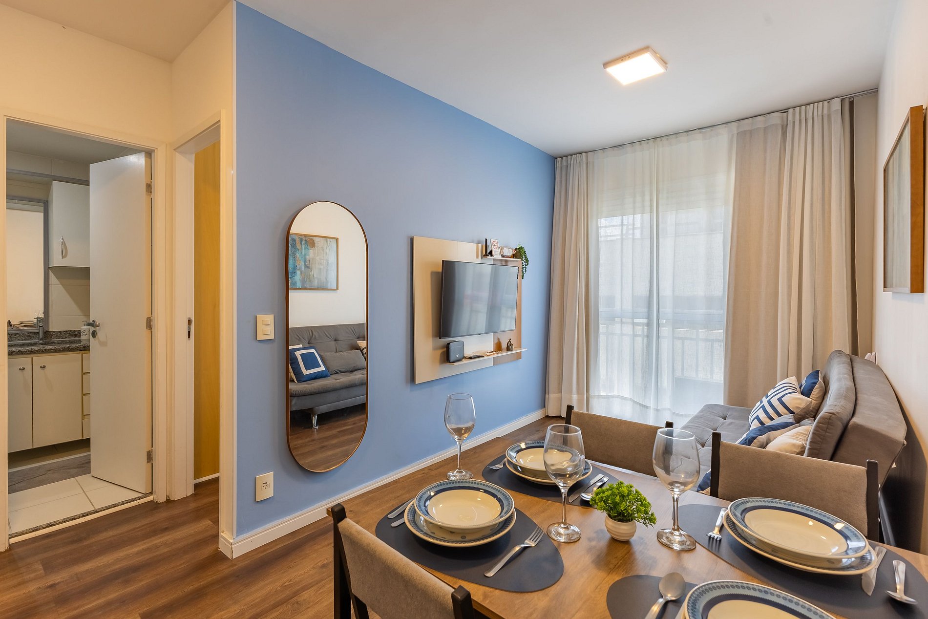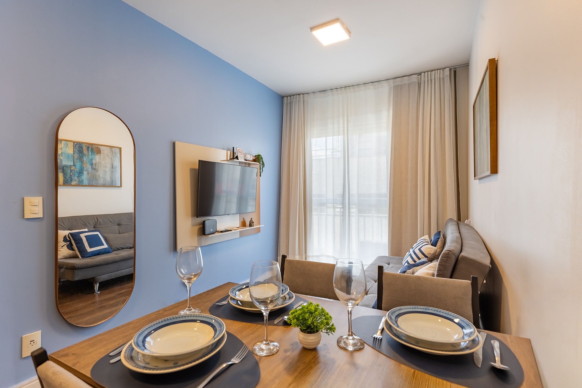 O apartamento oferece Wi-Fi, Smart TV, uma cama de casal confortável e um sofá-cama, acomodando até duas pessoas extras com comodidade.