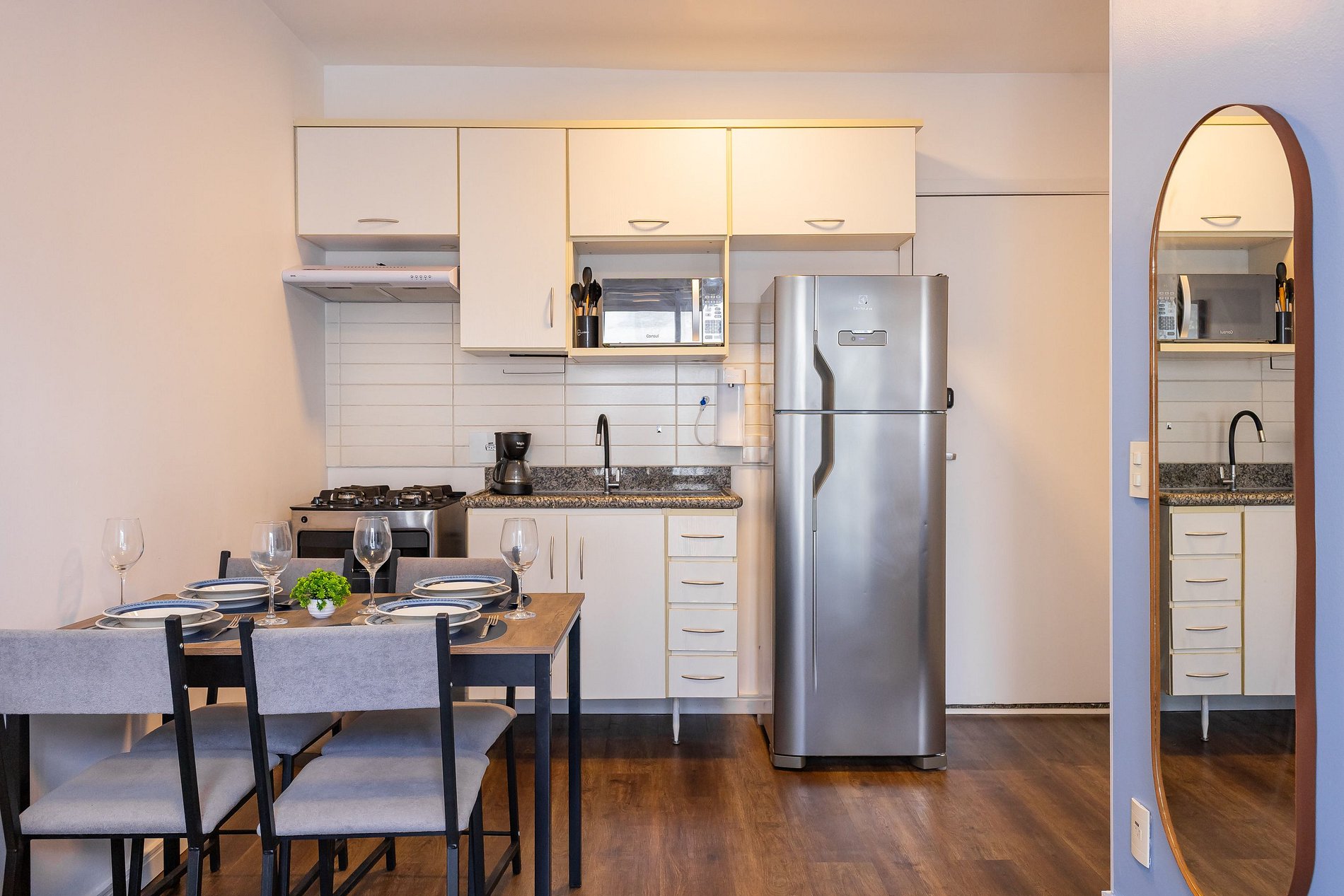 A cozinha é totalmente equipada com fogão, geladeira, filtro de água e todos os utensílios necessários. O banheiro conta com chuveiro a gás para um banho relaxante.