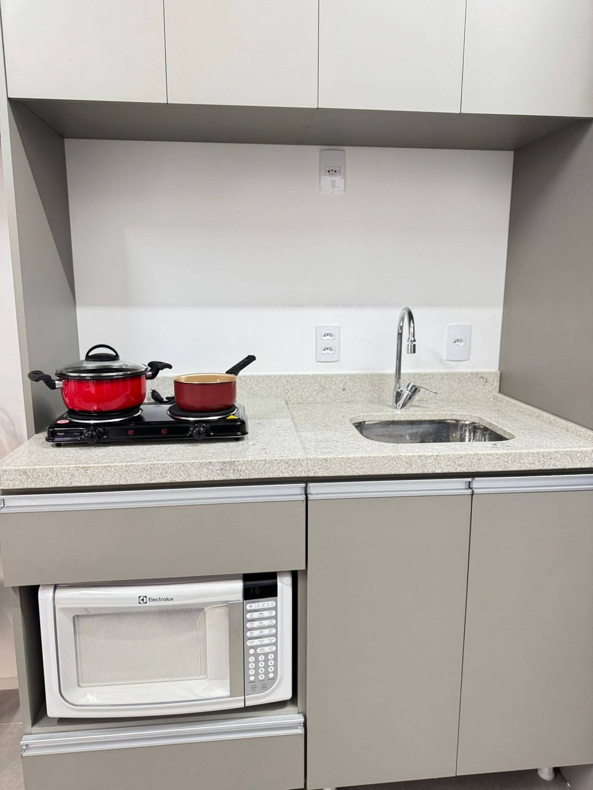 Cozinha equipada com fogão, geladeira e utensílios básicos