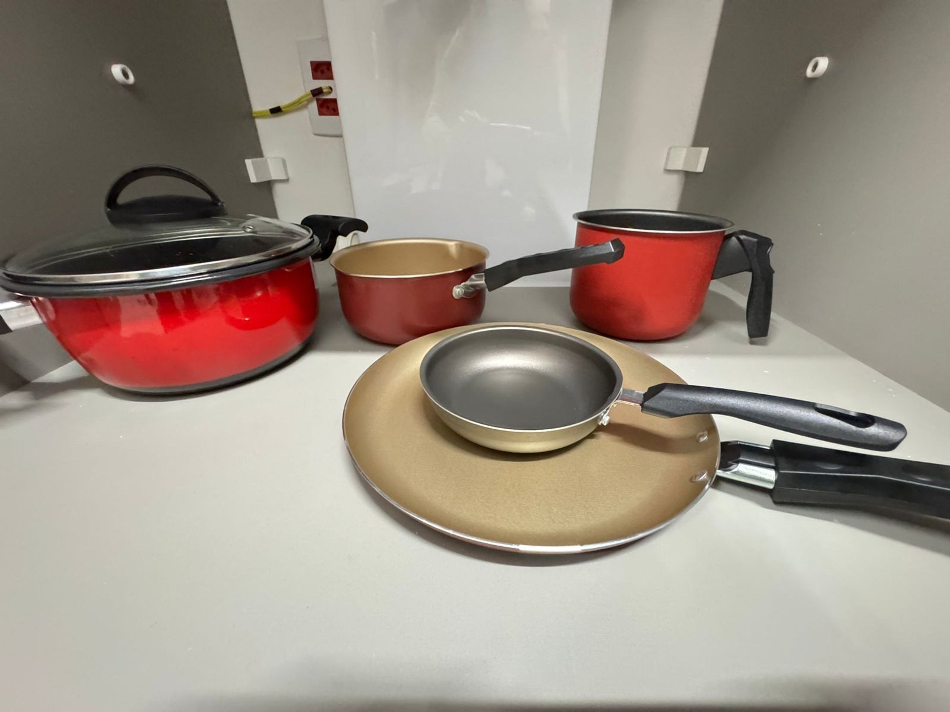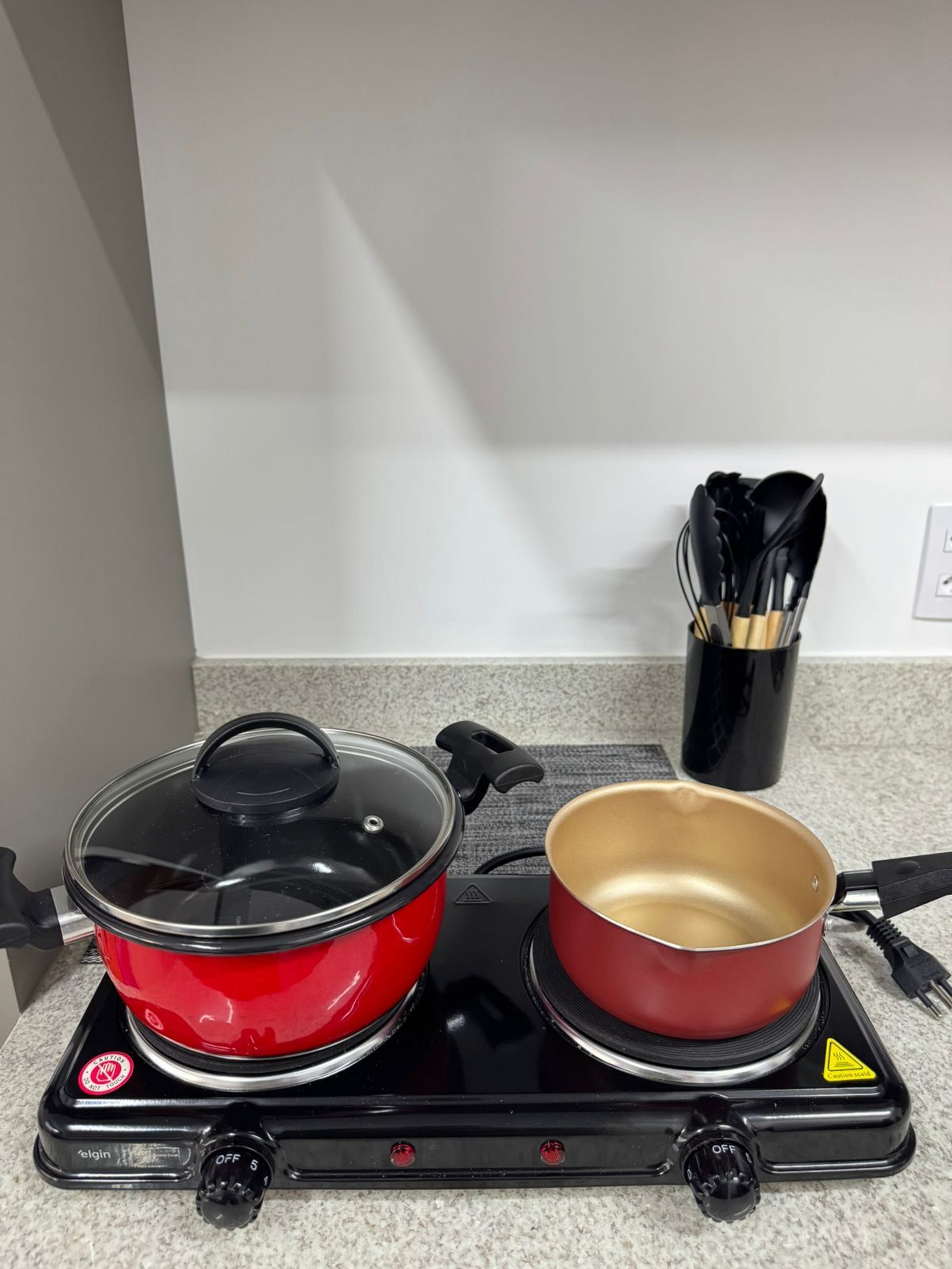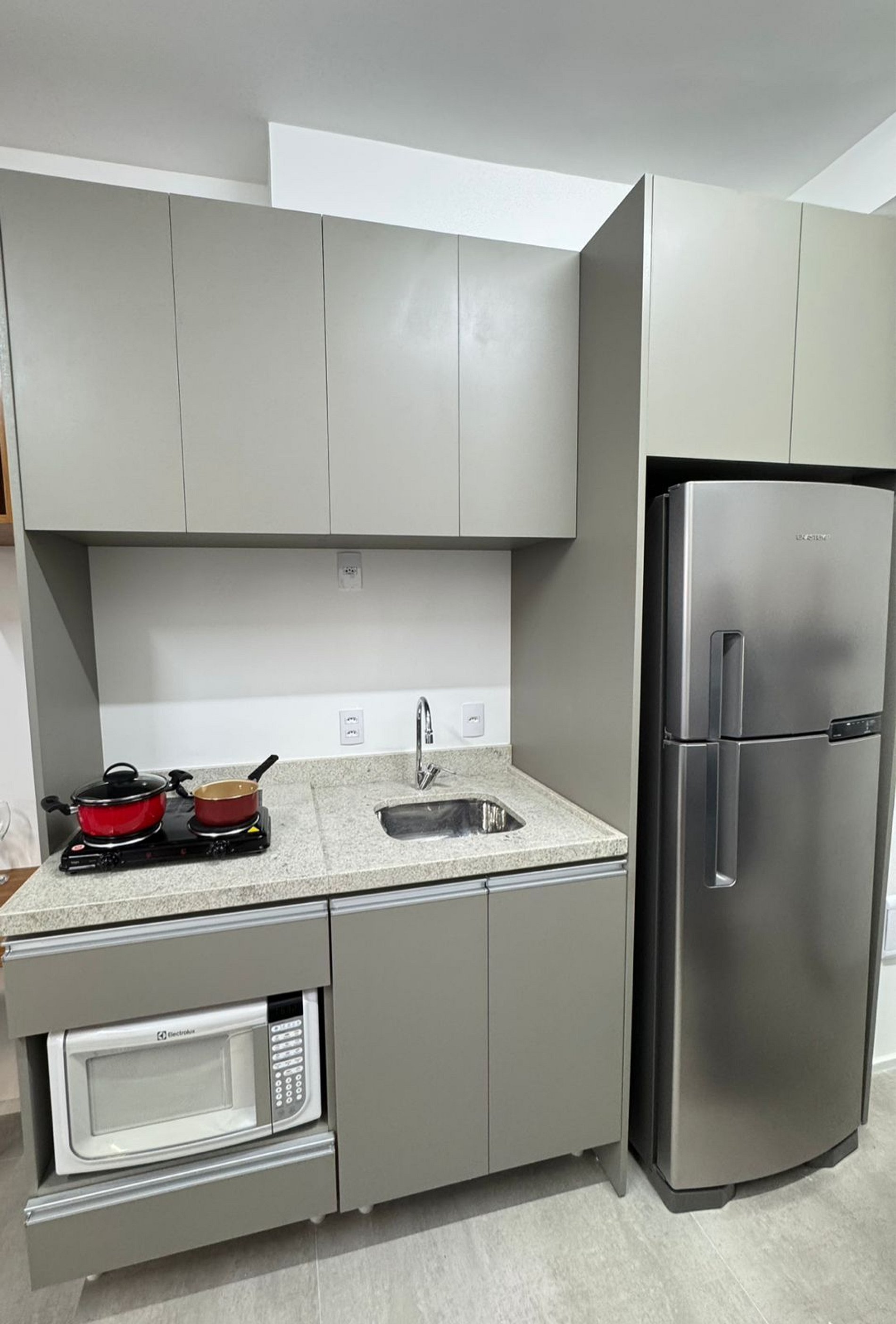 Cozinha equipada com fogão, geladeira e utensílios básicos